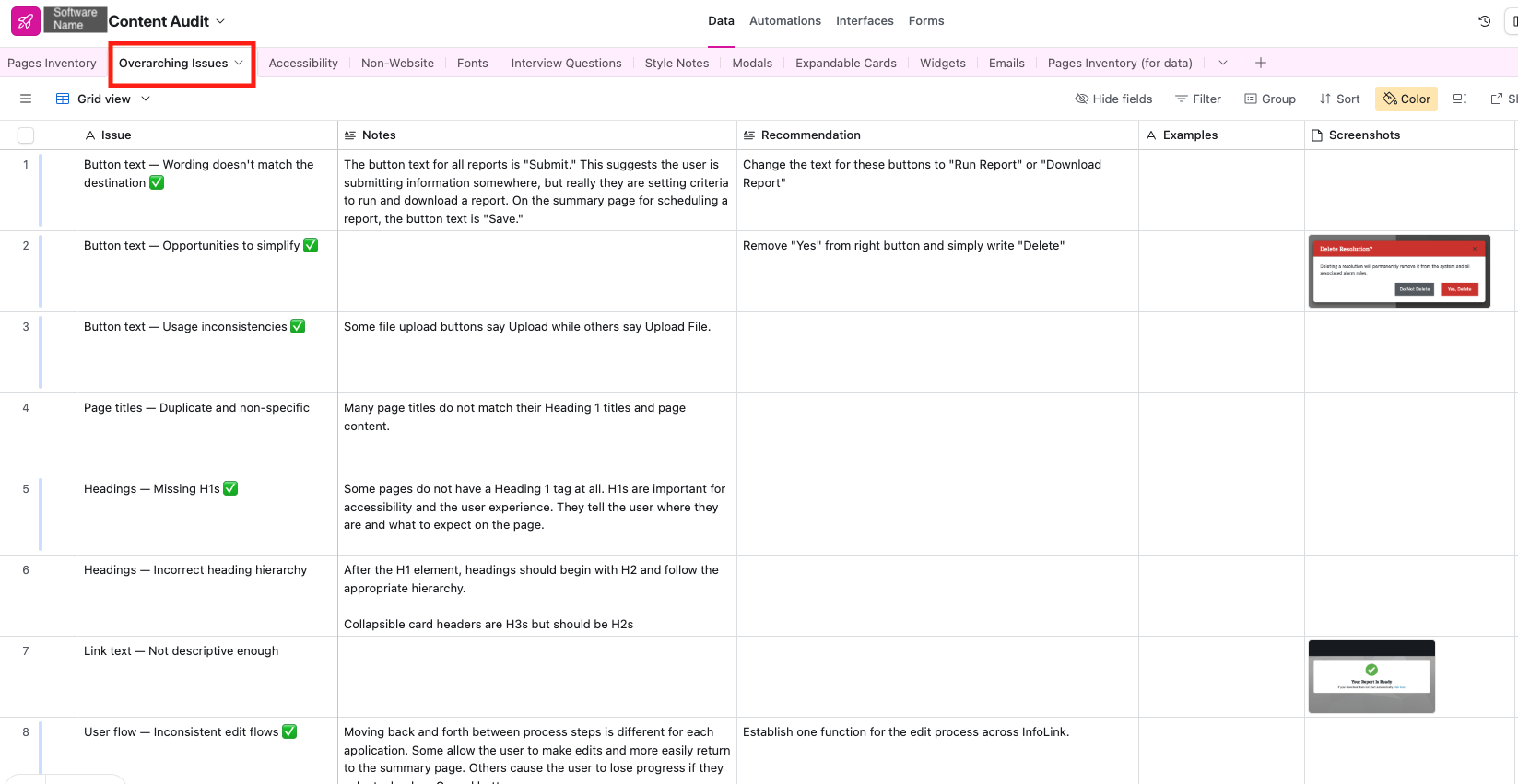 Software Content Audit: I inventoried the live software platform to identify inconsistencies in terminology, voice, error messaging, and button labels.